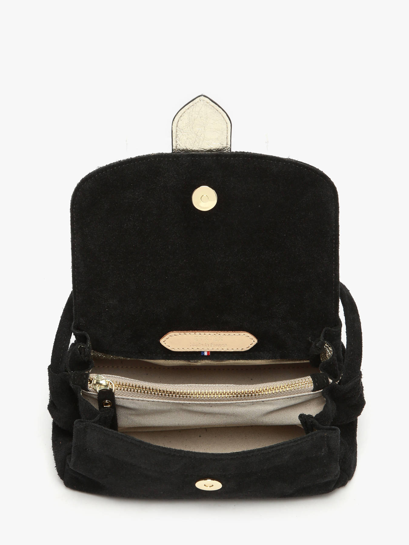 The AGNES crossbody bag by ETRIER is crafted from Italian suede leather, offering a soft and refined texture. This model is shown here in size S and features a flap closure secured with a magnetic snap button. It is also available in size M for those who prefer a roomier option. The bag includes a reversible tab featuring one gold side and one side in matching leather, allowing for easy personalization. It attaches effortlessly with two collar buttons and can be discreetly slipped into the dedicated back pocket when not in use. The interior, fully lined in gold leather, features three compartments, including a central zipped pocket, allowing you to organize your essentials with both practicality and elegance. The structured base ensures optimal support and maintains the bag's shape during daily use. The ETRIER logo, embossed on natural leather and accompanied by a small French flag, serves as a subtle marker of craftsmanship. The leather shoulder strap measures 130 cm upon delivery and can be easily adjusted using the discreet knot inside the bag—simply untie, adjust, and re-tie to achieve your ideal length. This model combines French craftsmanship, premium materials, and refined practicality. For even more personalization, explore our selection of animal-print statement tabs available on our website.